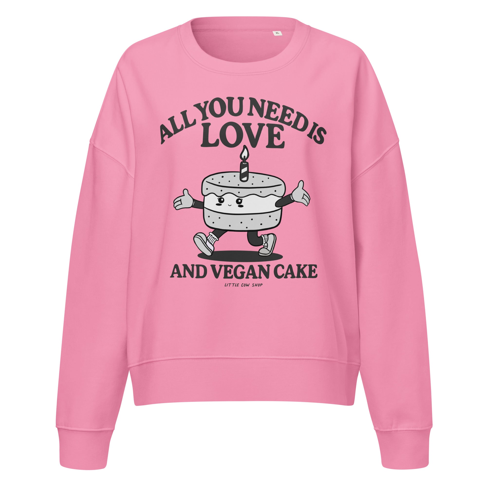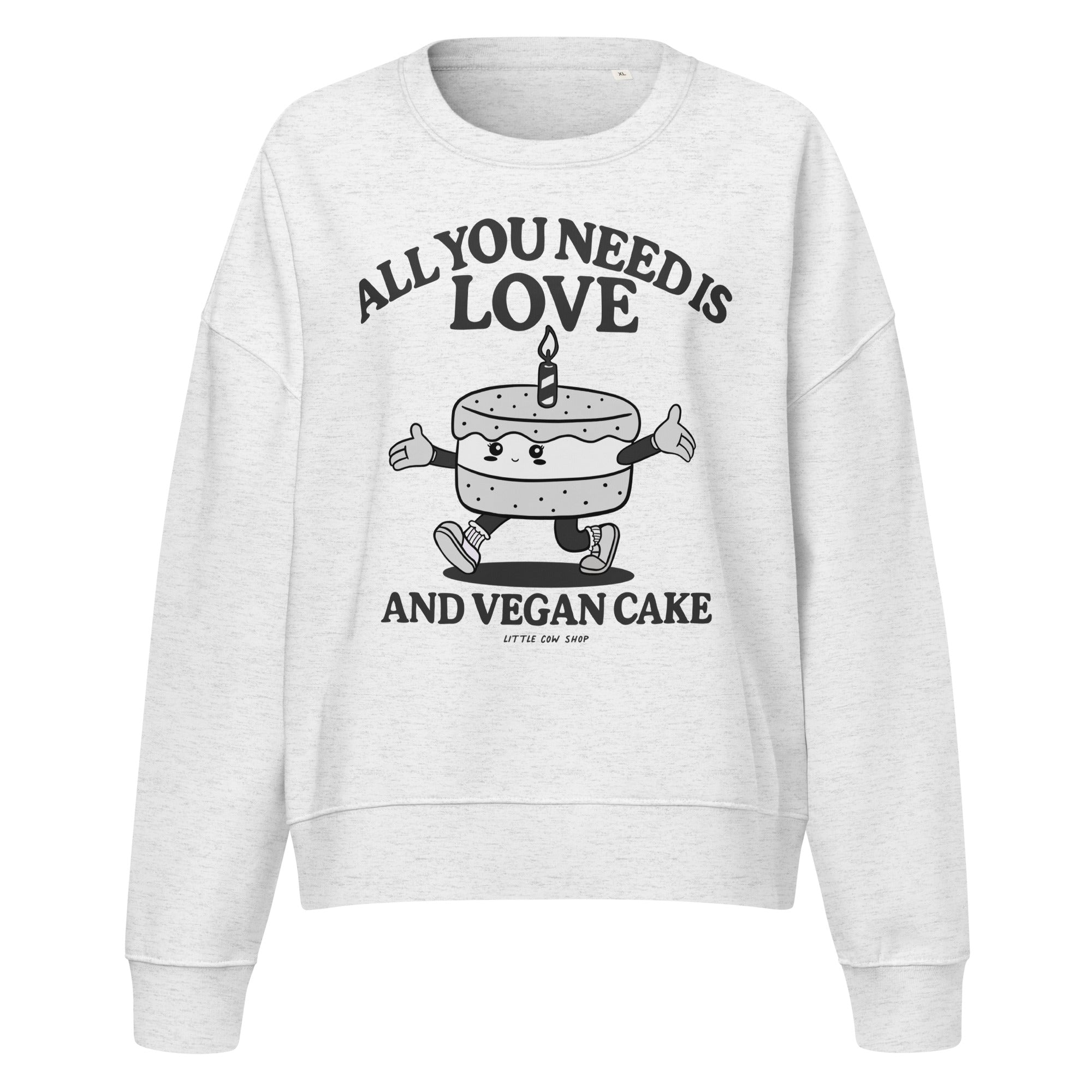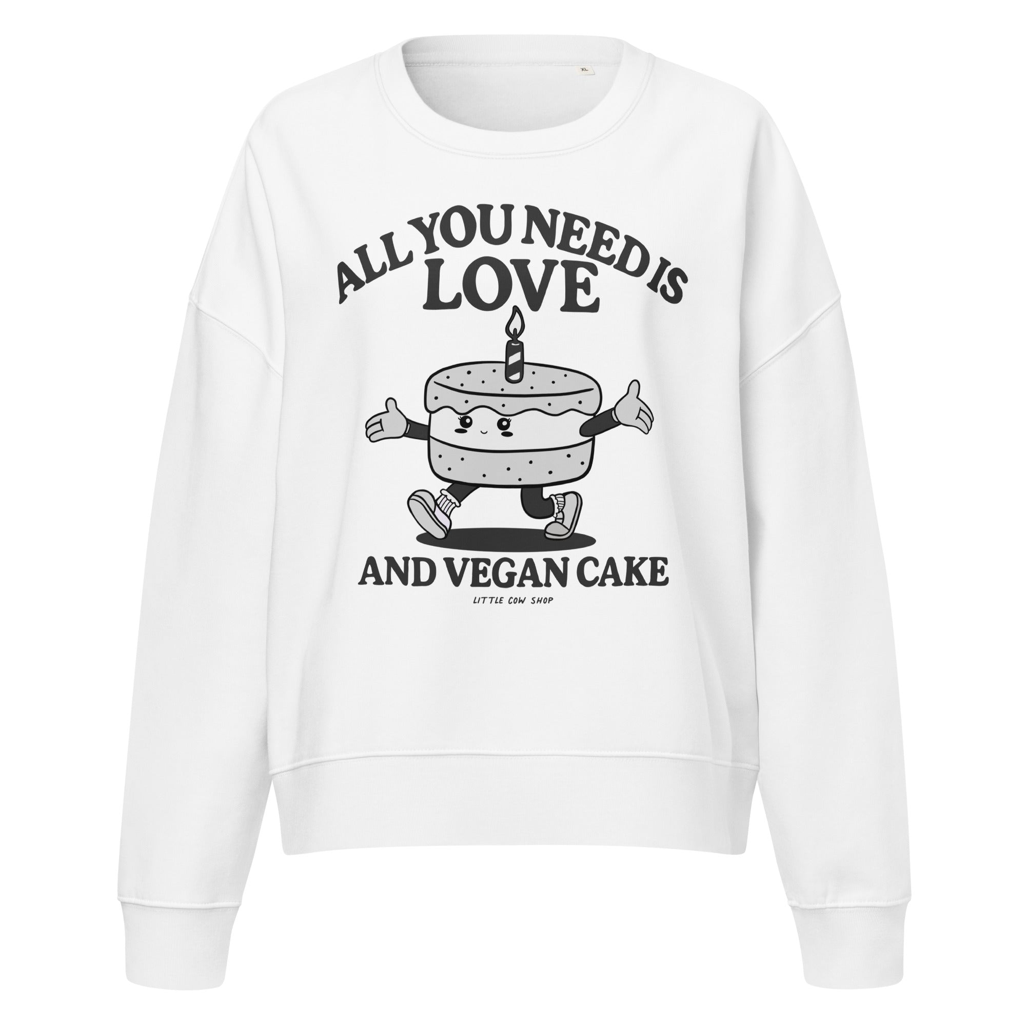 Our sustainable crewneck features our original "All You Need is Love and Vegan Cake" graphic printed on a high-quality, ethically sourced garment. Get comfortable in the softest sweatshirt you'll ever own. This organic crewneck features a relaxed fit, dropped shoulders, and a fleece interior so soft you won't want to take it off.