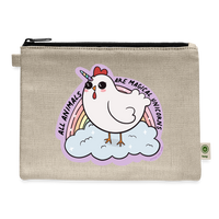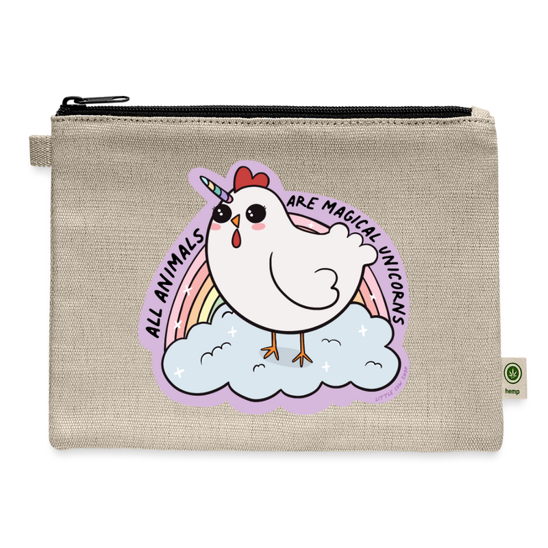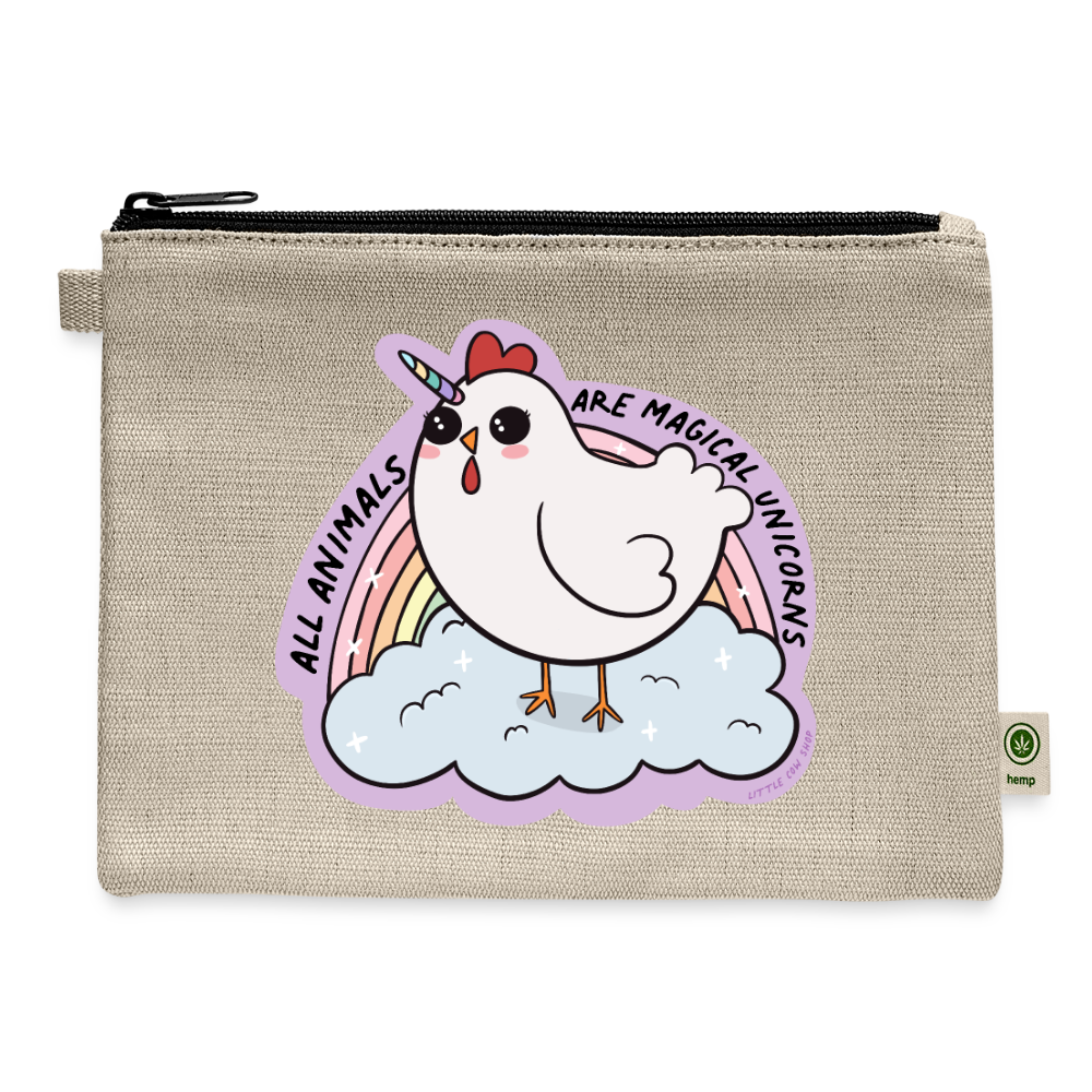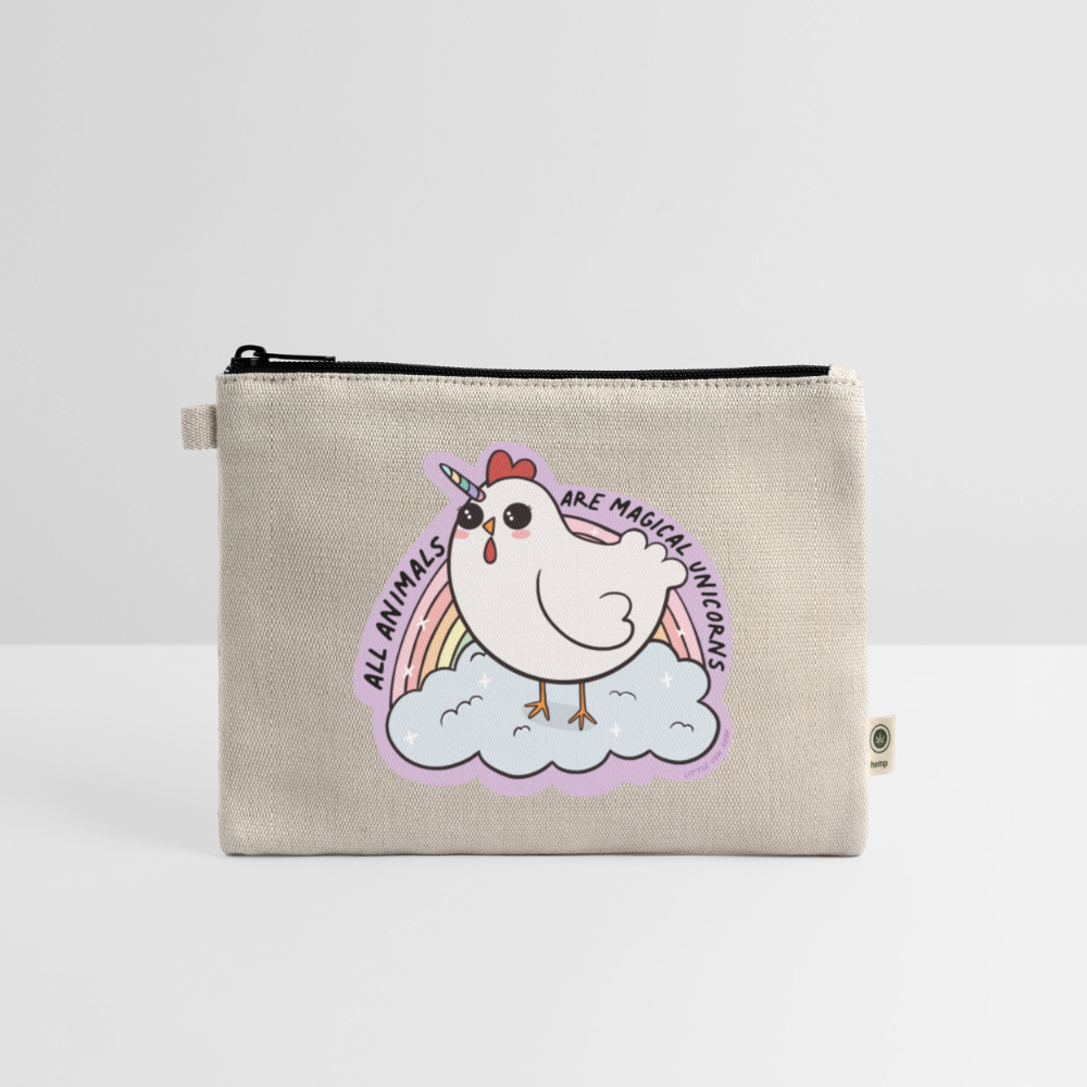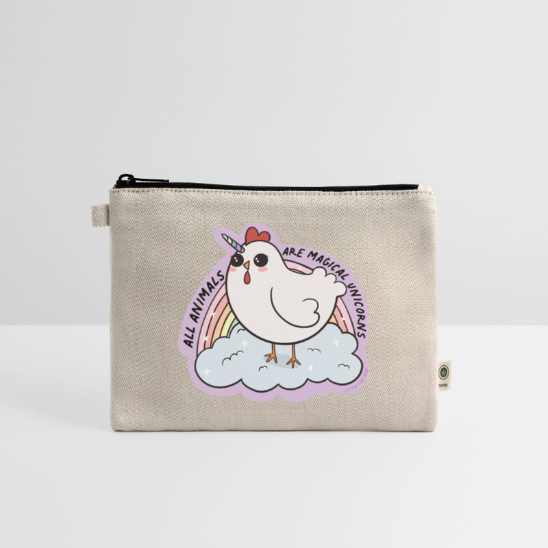 Meet your new favorite multi-purpose pouch! This charming bag features our exclusive "All Animals Are Magical" design, showcasing an adorable unicorn-horned chicken. Made with a sustainable and durable blend of 55% hemp and 45% cotton, it's the perfect vegan-friendly way to organize your makeup, art supplies, or travel essentials.